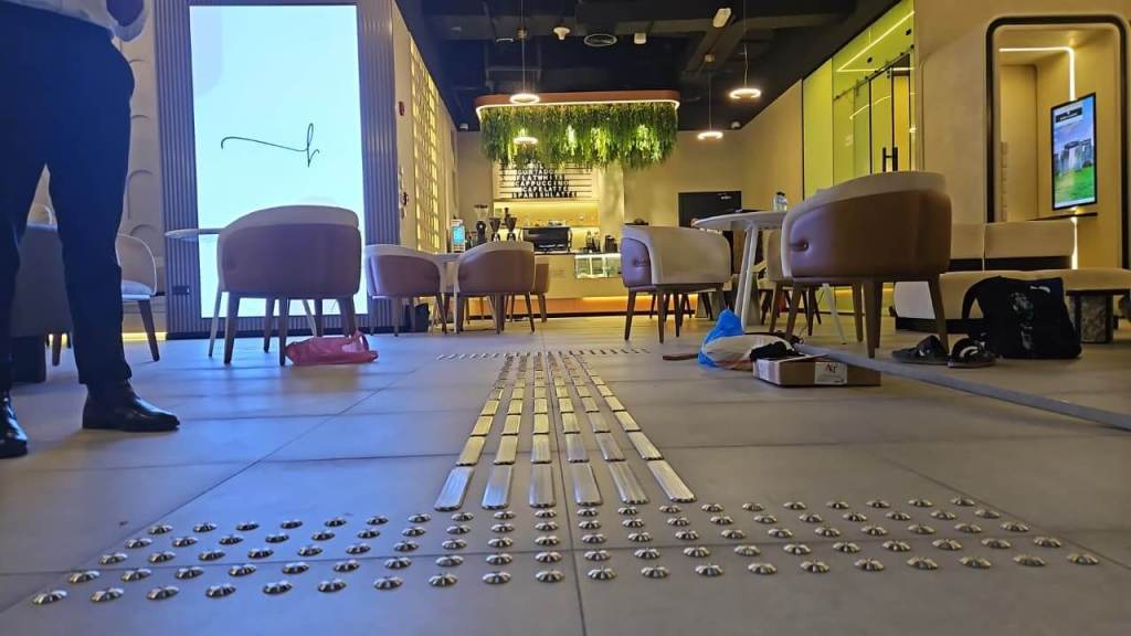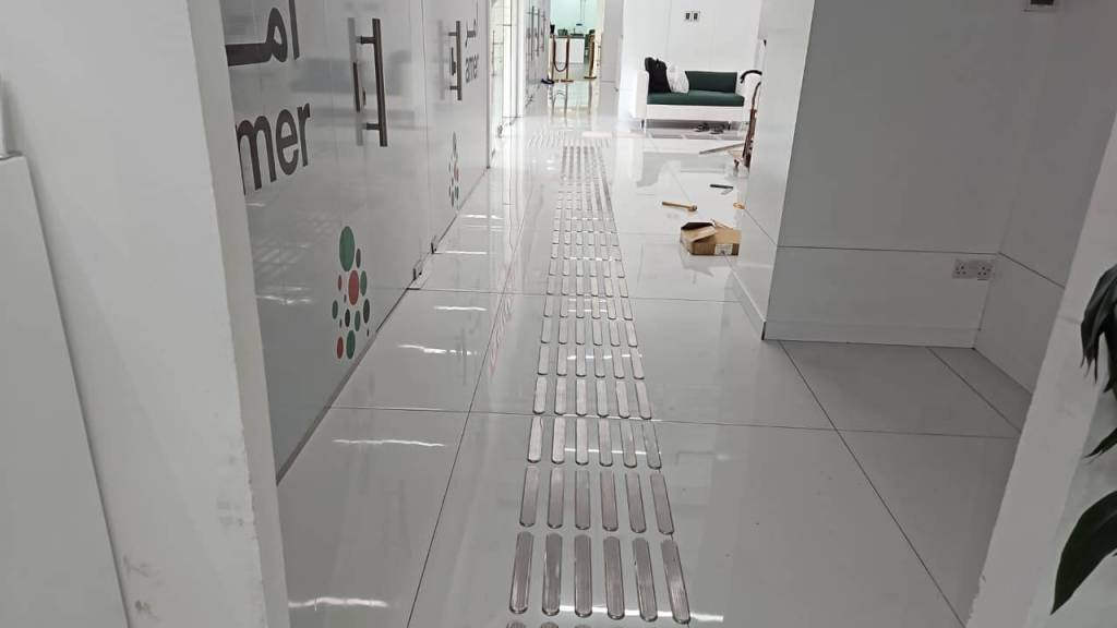 Tactiles.ae successfully installed stainless steel tactile studs and lines at the Real Estate Registration Trustee office in Dubai, enhancing accessibility for individuals with visual impairments.